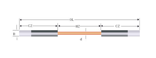 D:冷端直徑 ;d:熱端直徑;HZ:熱端長度; CZ:冷端長度; OL:總長